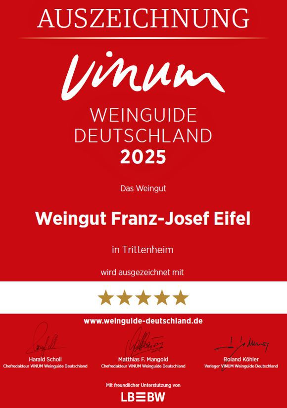 Leidenschaft“ und Goldstückchen. Gelegentlich werden auch Eisweine und Beerenauslesen ausgebaut, auch mit Sekt kann Franz-Josef Eifel punkten. Die Weine werden spontanvergoren, normalerweise;